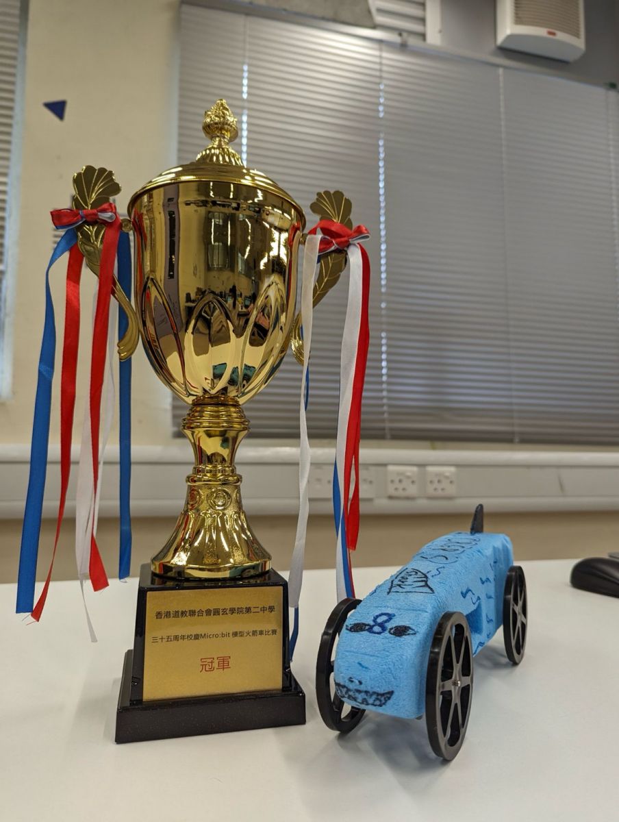 本校於4月27日參加了由香港道教聯合會圓玄學院第二中學舉辦的模型火箭車比賽。同學經過一輪的研究及反覆試錯下,設計出風阻極低的火箭車,最終從16組大埔小學生中脫穎而出,勇奪全場總冠軍!
