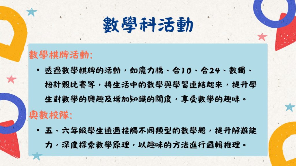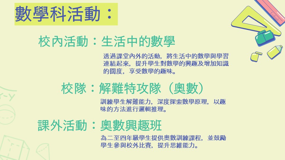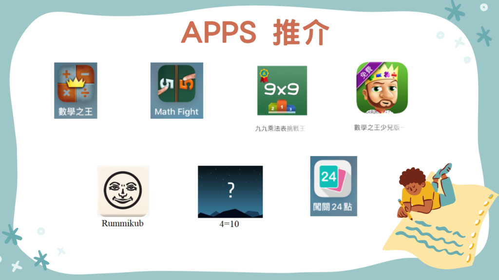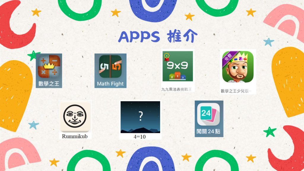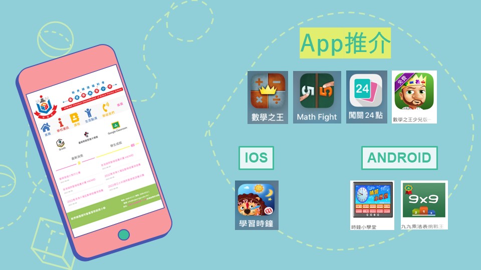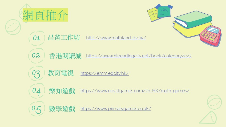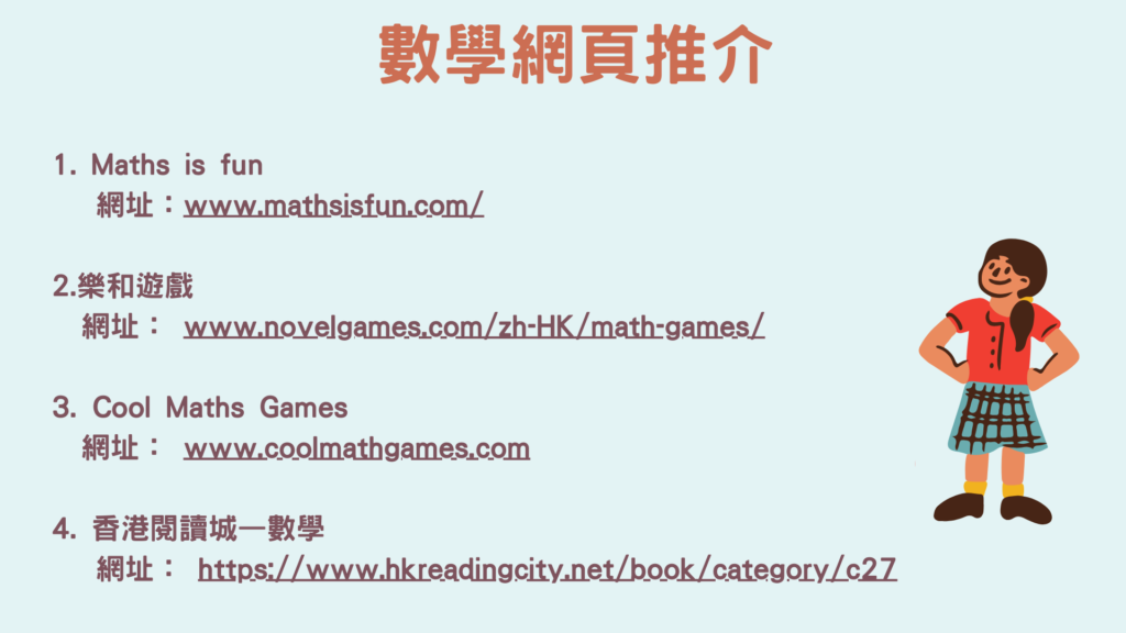 網頁推介 Maths is fun www.mathsisfun.com/ 樂和遊戲 www.novelgames.com/zh-HK/math-games/ Cool Maths Games www.coolmathgames.com 香港閱讀城—數學 https://www.hkreadingcity.net/book/category/c27 App推介