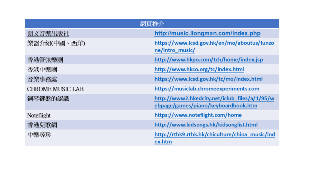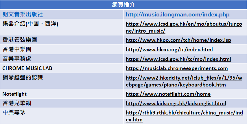 網頁推介 朗文音樂出版社 http://music.ilongman.com/index.php 樂器介紹(中國、西洋) https://www.lcsd.gov.hk/en/mo/aboutus/funzone/intro_music/ 香港管弦樂團 http://www.hkpo.com/tch/home/index.jsp 香港中樂團 http://www.hkco.org/tc/index.html 音樂事務處 https://www.lcsd.gov.hk/tc/mo/index.html CHROME MUSIC LAB https://musiclab.chromeexperiments.com 鋼琴鍵盤的認識 http://www2.hkedcity.net/iclub_files/a/1/95/webpage/games/piano/keyboardbook.htm Noteflight https://www.noteflight.com/home 香港兒歌網 http://www.kidsongs.hk/kidsonglist.html 中樂尋珍 http://rthk9.rthk.hk/chiculture/china_music/index.htm App推介
