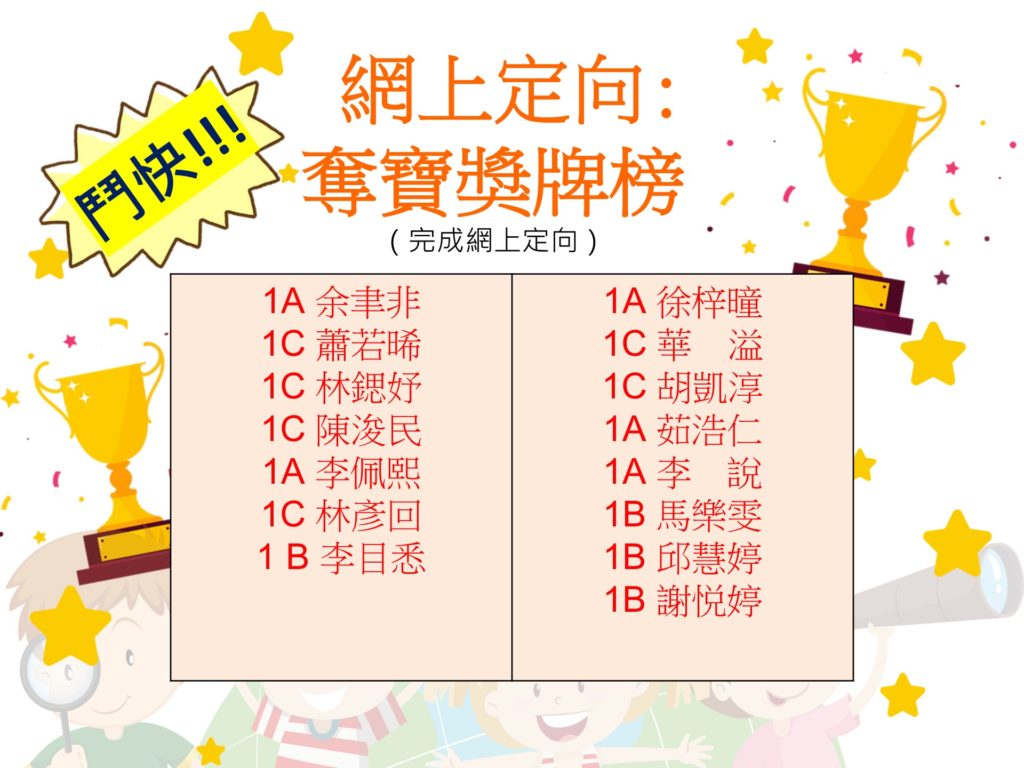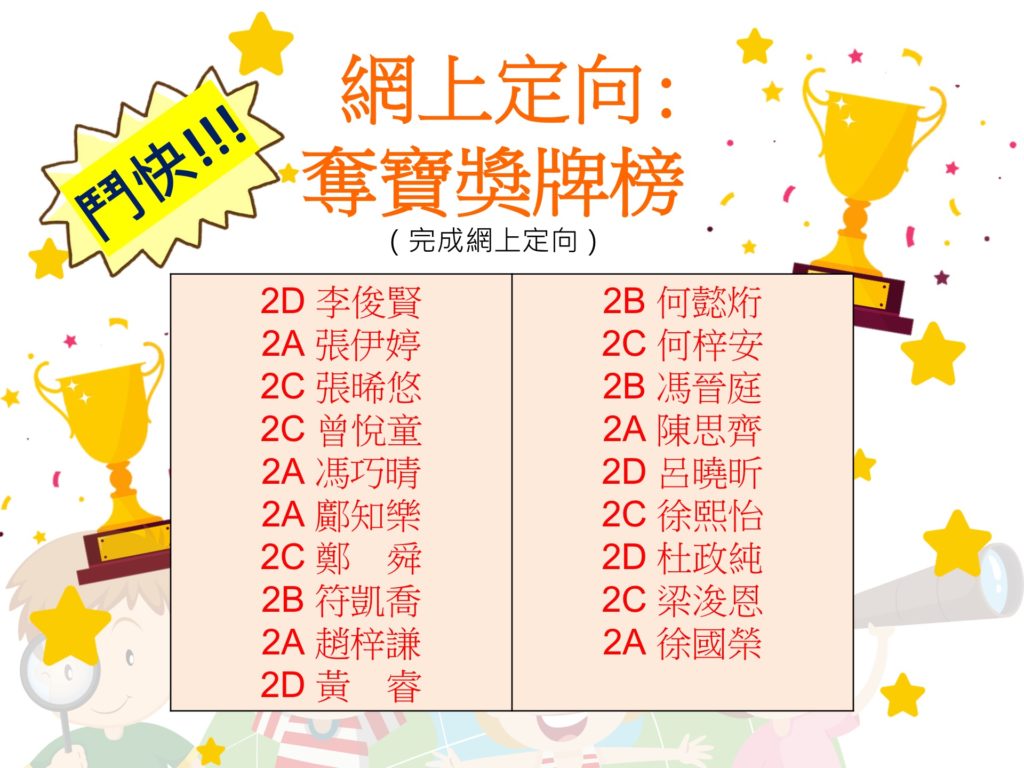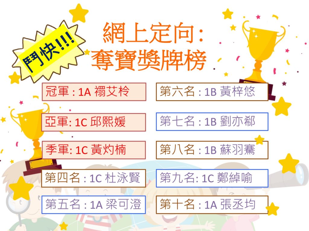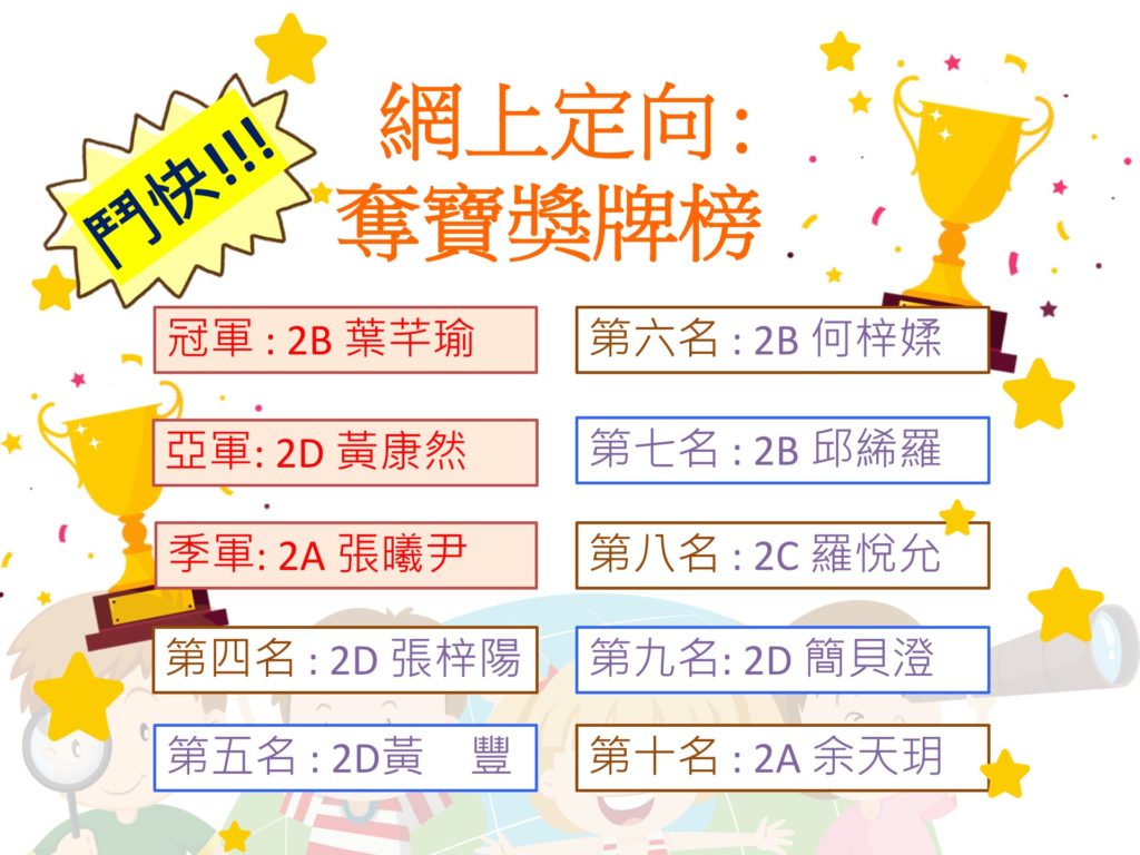 Post published:2022-03-15 Post category:學校資訊 / 學生成就 分享到 網上定向 一年級奪寶獎牌榜: 網上定向 二年級奪寶獎牌榜: 網上定向 三年級奪寶獎牌榜: 網上定向 四年級奪寶獎牌榜: 網上定向 各級完成榜:
