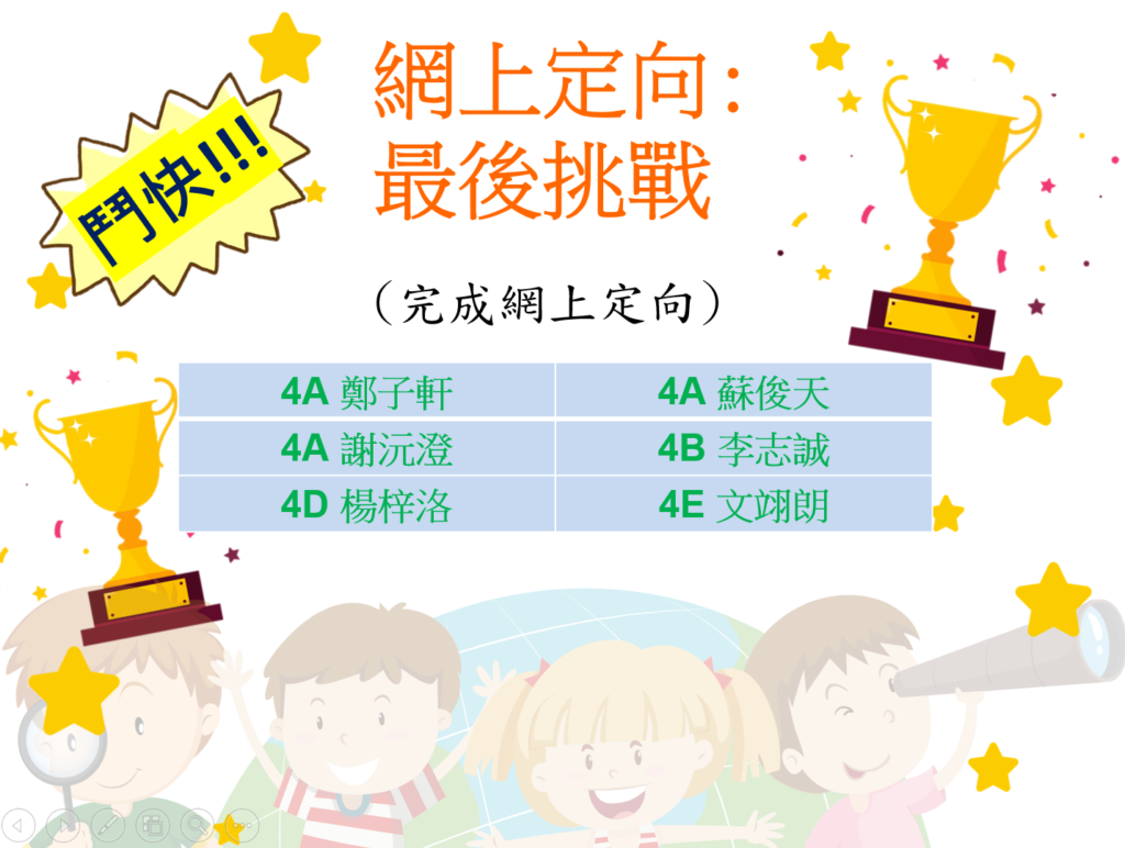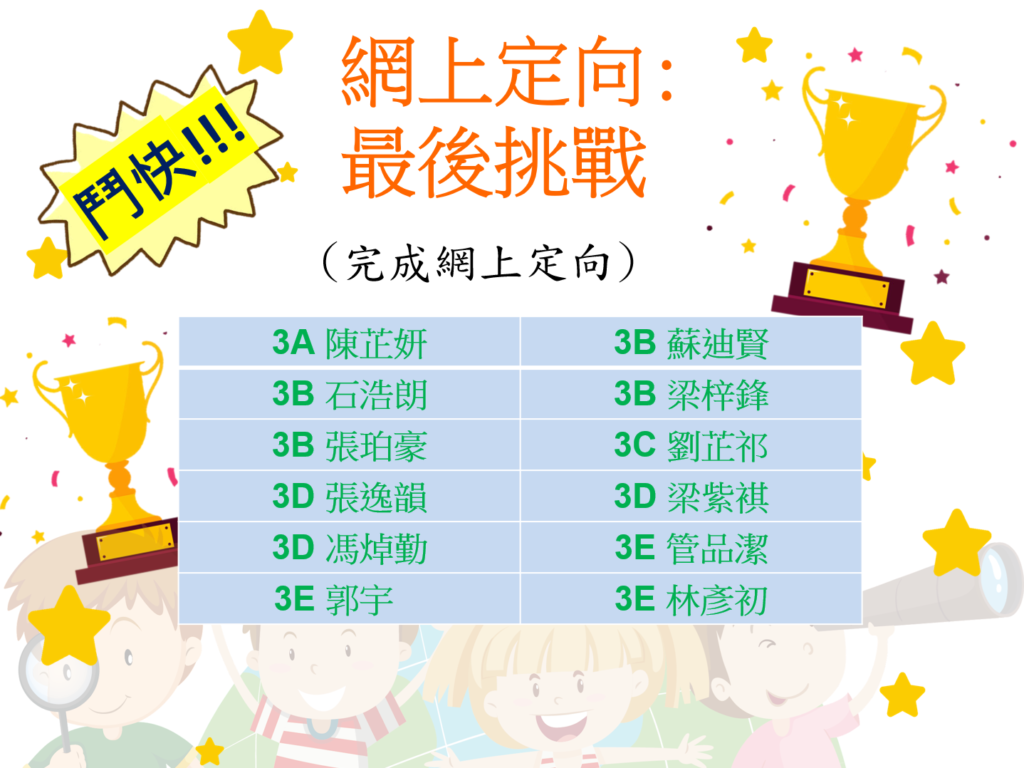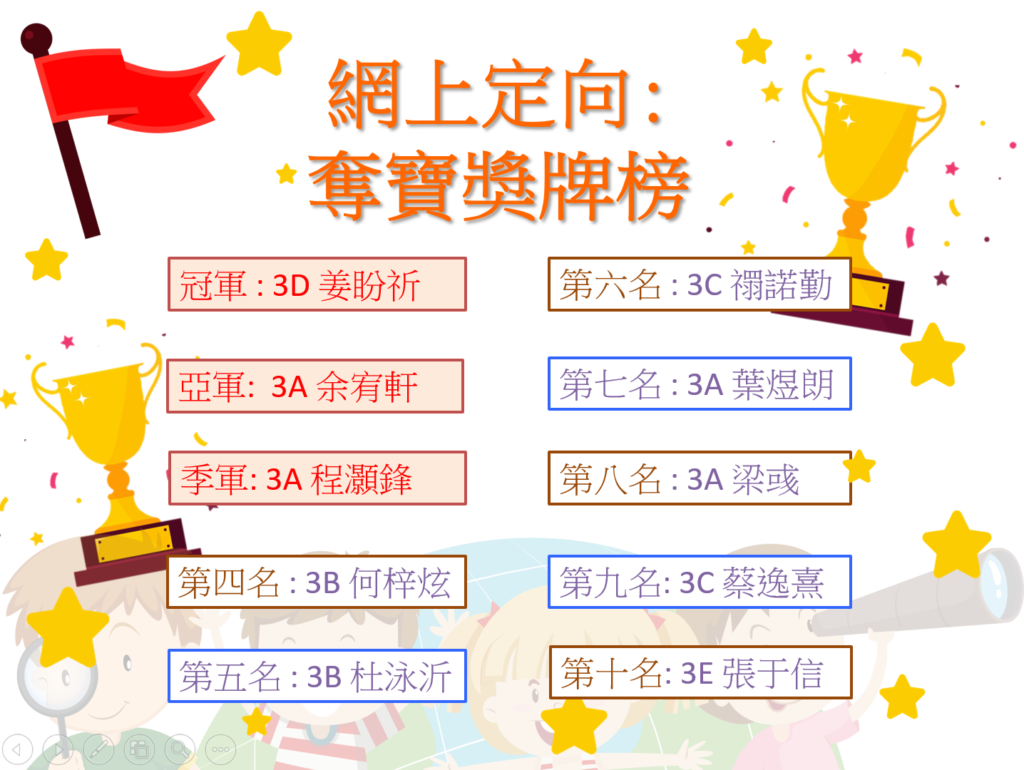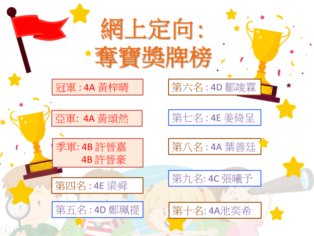Post published:2022-03-15 Post category:學校資訊 / 學生成就 分享到 網上定向 一年級奪寶獎牌榜: 網上定向 二年級奪寶獎牌榜: 網上定向 三年級奪寶獎牌榜: 網上定向 四年級奪寶獎牌榜: 網上定向 各級完成榜: